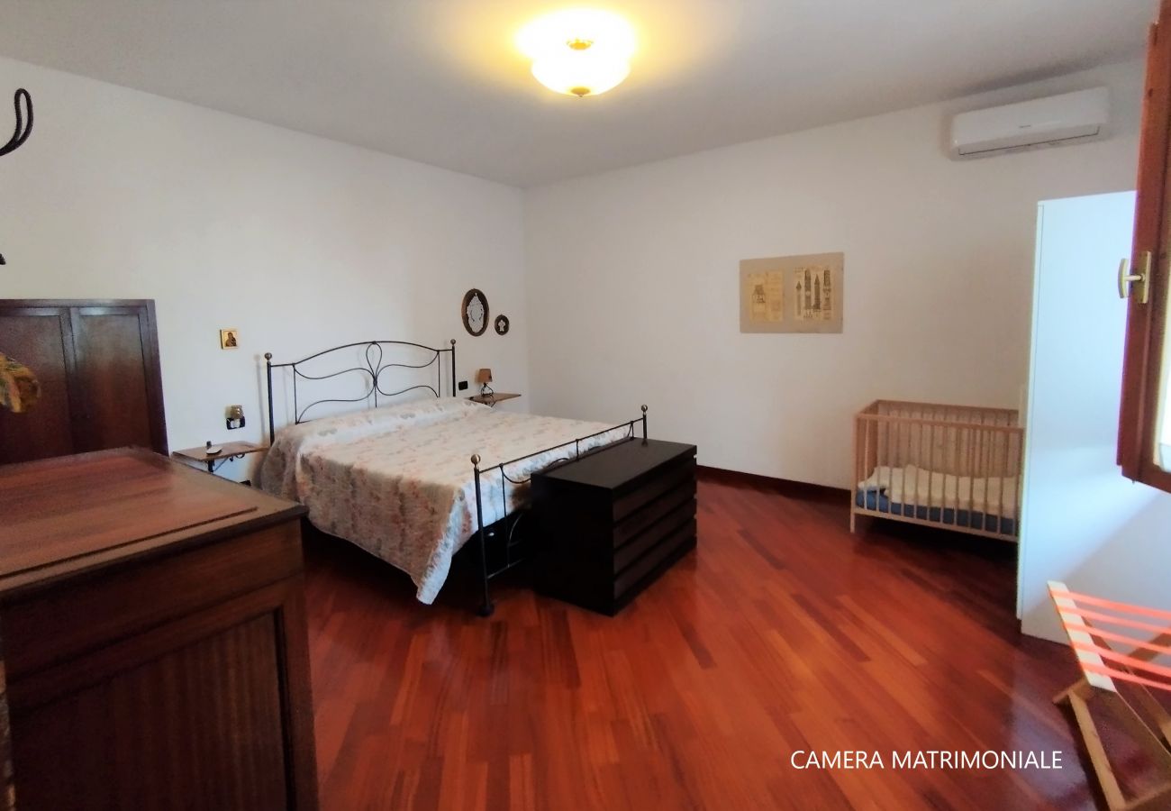 Im Obergeschoss befindet sich das Schlafzimmer mit Doppelbett und einem Kinderbett für Kinder bis zu drei Jahren, das zweite Badezimmer mit Dusche und Badewanne und ein weiteres Schlafzimmer mit zwei Einzelbetten.
