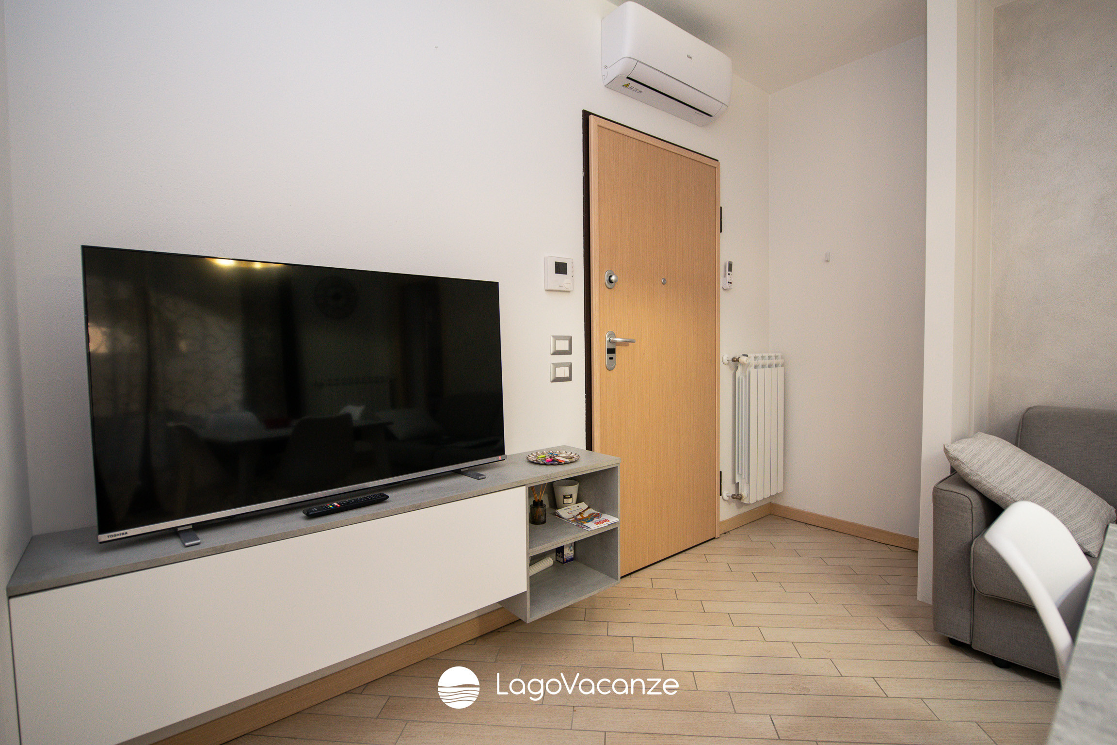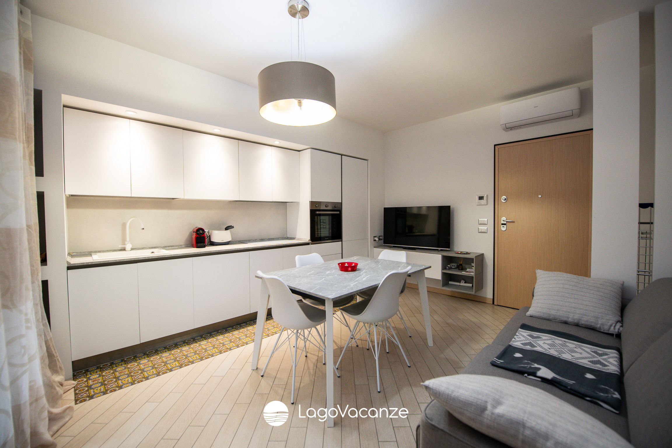 The living area is bright and functional, furnished with an equipped kitchenette, TV and dining table, perfect for sharing convivial moments after a day by the lake.