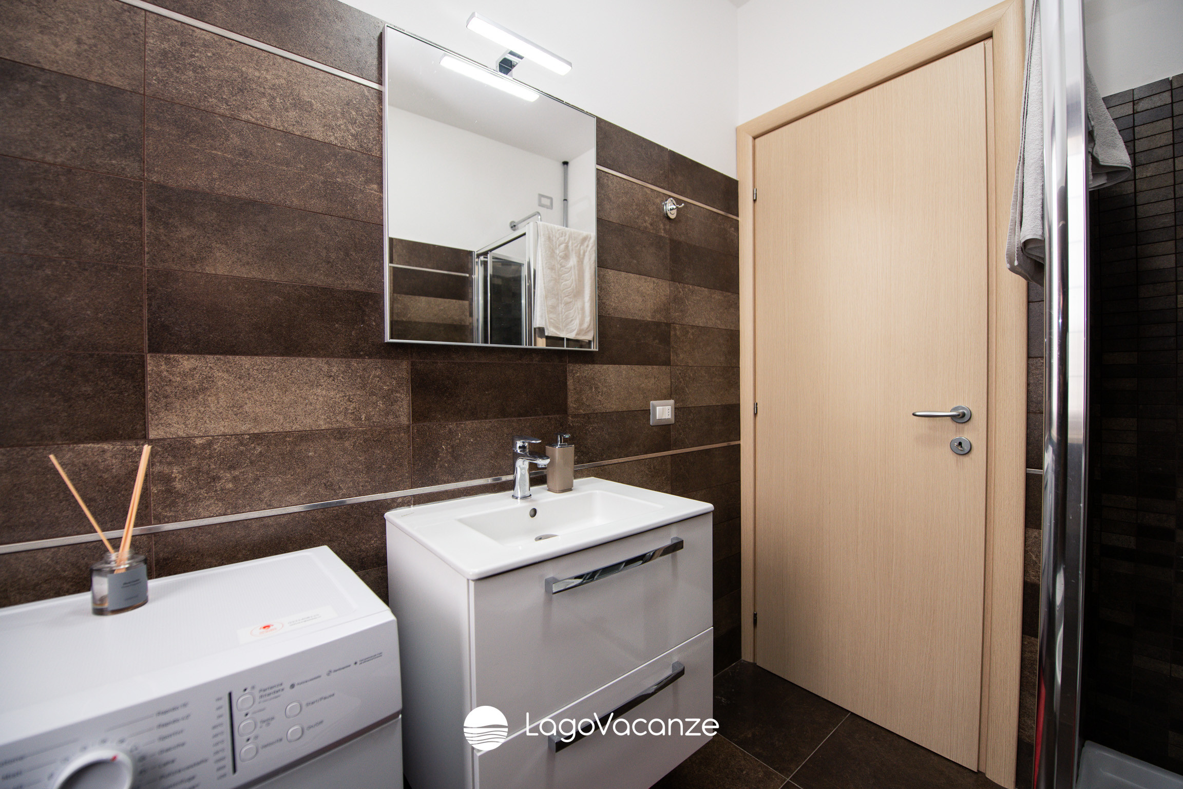 The bathroom is complete with a shower, bidet and washing machine, ensuring practicality even for longer stays.