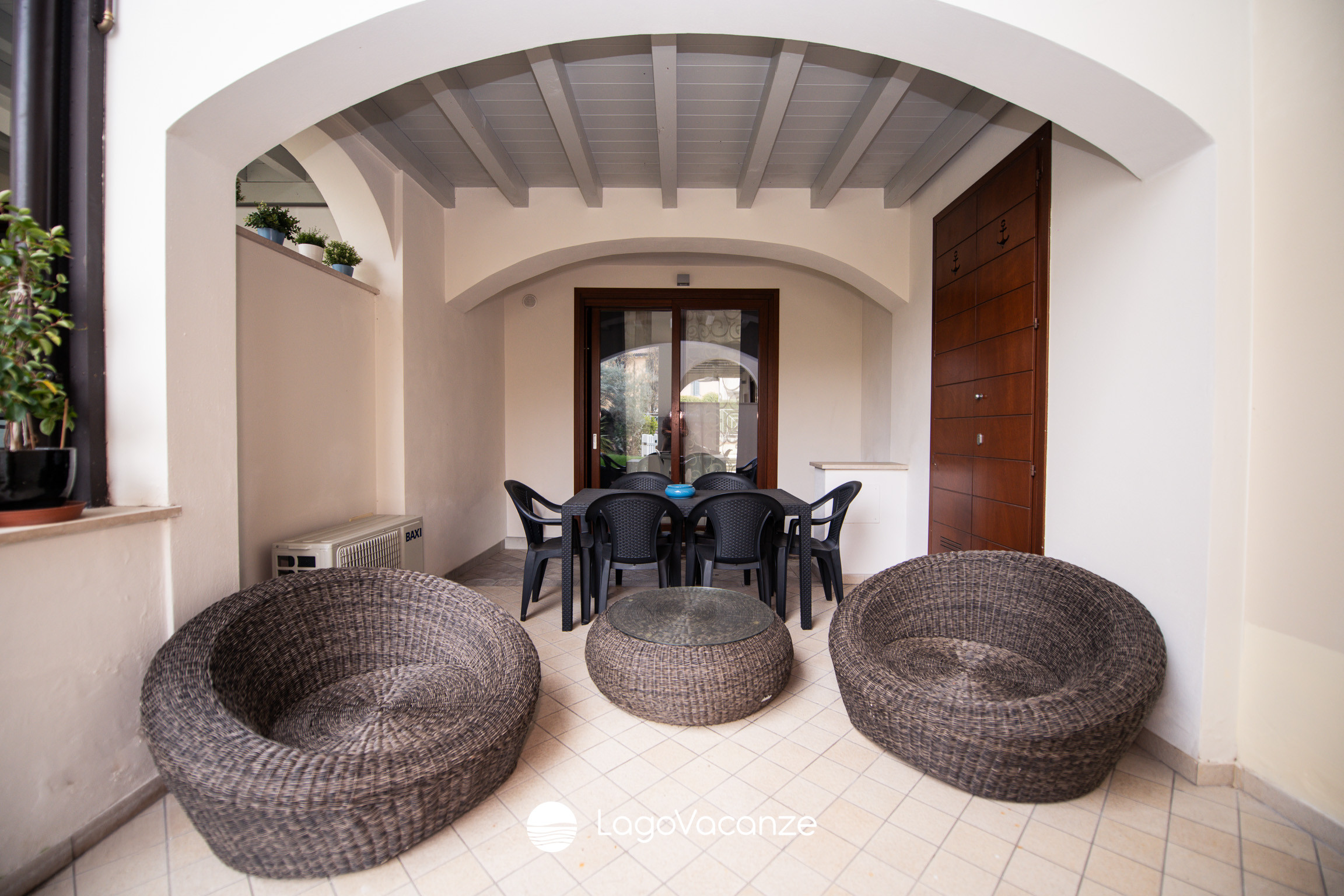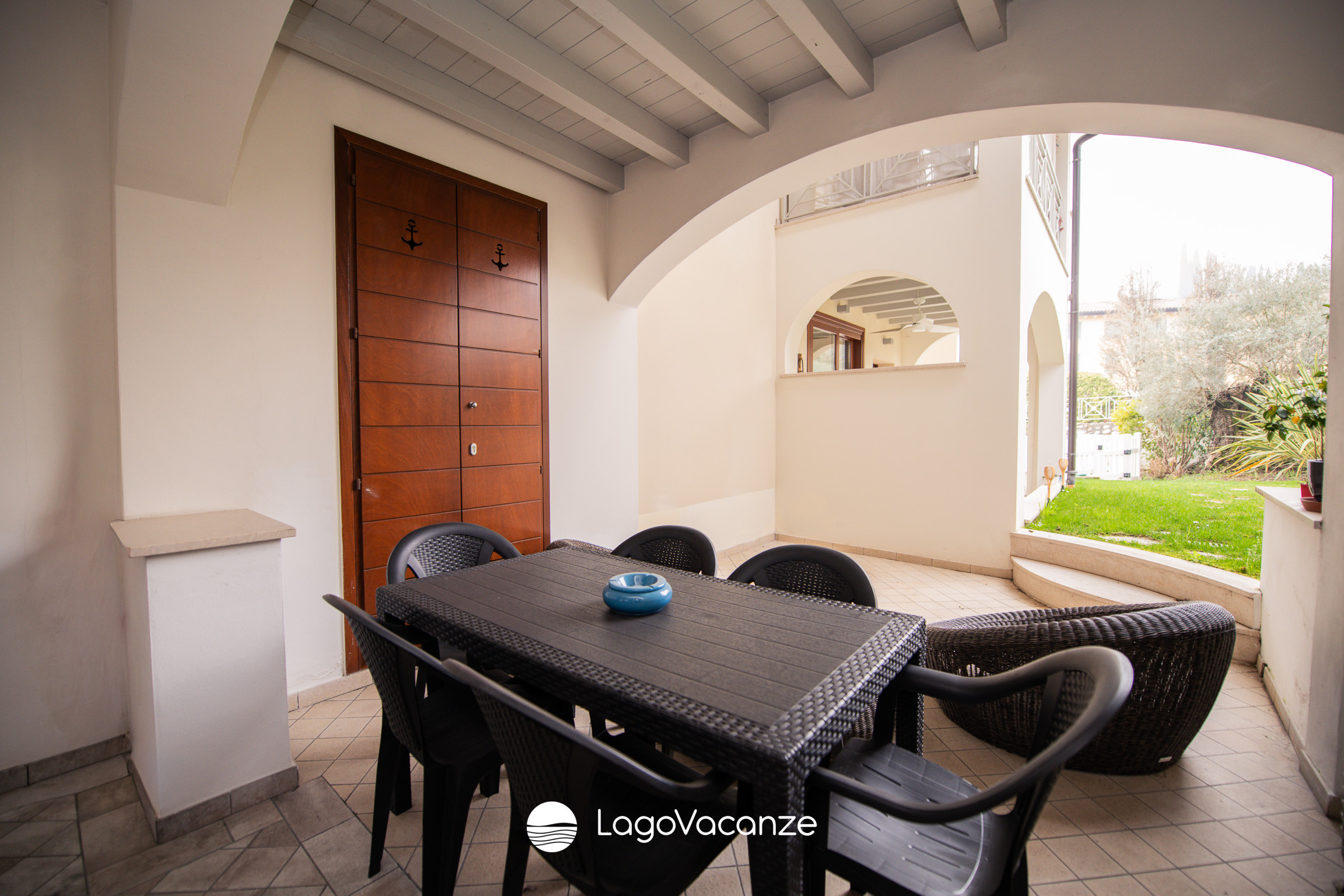 Outside, there is a pleasant portico furnished with a table, chairs, and armchairs, ideal for relaxing in the open air or enjoying lunches and dinners in tranquillity.